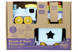 All aboard! The Green Toys Stack & Sort Train is a one-stop shop for practicing motor skills, color matching, counting, sorting, stacking, and just plain fun! The 12-piece Train set includes a train engine, shape sorting car with removable roof, cargo car, 4 shapes (circle, square, triangle, and star) featuring a puppy, kitten, mouse, and bunny, and 4 numbered, graduated stacking pieces that nest easily in the cargo car, with designs that match their corresponding-color shape. (For example, the puppy shape piece is the same color as the dog bone stacking piece.)
