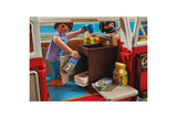 It is an icon on the road: the Volkswagen T1 Camping Bus. Loved by generations, countless adventurers have traveled the world in this camping bus. Of course also the PLAYMOBIL version has many characteristic details, such as the iconographic V-shaped front end with red and white colour separation and red VW logo, rounded roof, split windshield and removable roof rack. When opening the roof section, the authentically designed interior becomes visible. In true style, the interior of the T1 offers a folding table with two seats and a sink with refrigerator. The benches with typical 60’s check pattern can be converted into a sleeping area for two people. The side doors can be opened as well, one door includes a shelf for food and the other a hinged shelf and mirror. The Volkswagen T1 Camping Bus: get in, drive off and enjoy the freedom! The playset contains two PLAYMOBIL figures, a Volkswagen T1 Camping Bus with removable roof and suitcases, detailed interior with folding dining table, foldable back seat, side doors with mirror and space for food and many other loving extras.