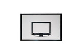 Combo includes a hardwood white backboard with black lines and a black ring with net hooks.