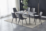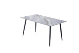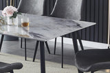 The table’s sintered stone top is resilient and easy to clean, while the metal frame with a black powder coating offers a sturdy base. The chairs are crafted from high-grade PU for a leather-like feel, supported by a matching black powder-coated metal frame.
