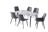 The table boasts a refined marble aesthetic without the maintenance of real stone, and the chairs feature a curved backrest for ergonomic support.