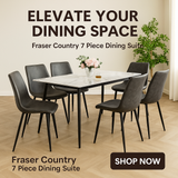 This Fraser Country 7 Piece Dining Suite is a luxurious addition to any modern dining space. This suite features a spacious table crafted from 11mm sintered stone, providing a marble-like finish that exudes sophistication. Accompanied by six sleek chairs finished in high-quality PU, this set is the perfect blend of durability and style.