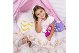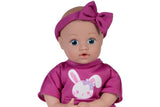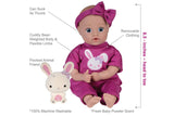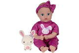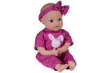 She is outfitted in a magenta jersey knit onesie with a front pocket and a graphic print of glittered bunny that resembles her Spirit Animal friend, a mini flocked toy bunny that she arrives with! She also wears a matching bow headband to accessorize her hand-painted hair. She is 100% Machine Washable, perfect for the little hands to hold and love. She also has a weighted bean bottom with cuddly soft body and vinyl limbs crafted from our premium vinyl material, making her a perfect 1st baby doll for toddlers.