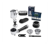 Includes metal tamper, tamping mat and Stainless Steel milk jug and cleaning tool