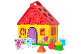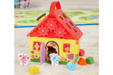 - Includes 5 colorful wooden shaped blocks to sort in holes in the roof, and wooden Blue and Magenta shape-sorting play pieces that fit through the door
