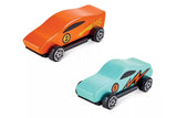 - Includes 1 orange and 1 blue wooden racing cars with stunt racing paint jobs.