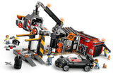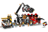 - LEGO junkyard toy with claw crane, crusher, office, 2 cars and 4 minifigures