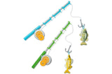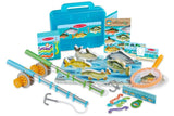- 21-piece pretend play fishing play set with rods, bait, wooden fish, tackle box, and activity cards