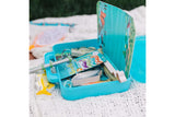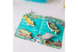 Grab the two wooden fishing rods, bait the hooks with pretend worms, then hook and scoop up the six wooden fish! A reversible play mat lets young anglers choose a winter or summer experience. The illustrated fishing guide helps identify fish types, explains fishing basics, and includes fun games. Everything stores in the tackle box for quick and easy cleanup.