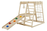 - This jungle gyms standout feature is its versatility. With one quick flip, the frame transforms from a climbing wall adorned with colorful holds to a fun-filled slide. Now, with the addition of a secure swing, it becomes a complete playground set, ensuring hours of entertainment and joy.
