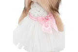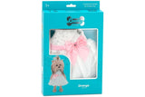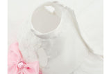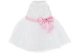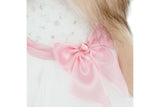 Total elegance – a dress with layers of soft white tulle, big soft pink satin ribbon bow with a pink gemstone like-jewel to finish the bow. The top of the dress is made up of white lace daisies.