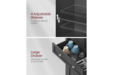 Store all your food in the top cabinet, extra spices on the cabinet door shelves, kitchen appliances in the bottom cabinet, and use the middle drawer for dinnerware or kitchen towels—with everything sorted in order in this pantry, finding what you need has never been so easy!