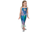 - Mermaid style dress with shimmery satin bodice featuring Ariel character art on the chest in a shell-shaped design