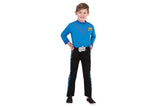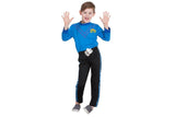 He is the blue Wiggle, known for singing and dancing and eating yummy, yummy fruit salad. He is a member of the popular Australian pre-school entertainers The Wiggles. Skivvy with collar and printed V stripes and logo on chest. Pants with elastic waist band and double stripe down legs. Attached mock belt buckle in metallic fabric with printed logo. Packaging is in a snap lock polybag.