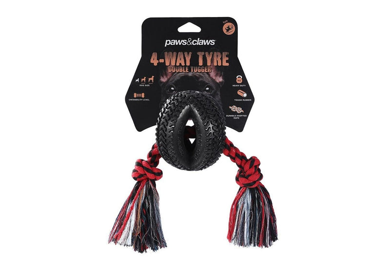 Calling all strong biters to try the Paws & Claws 4-Way Tyre Double Tugger Toy.