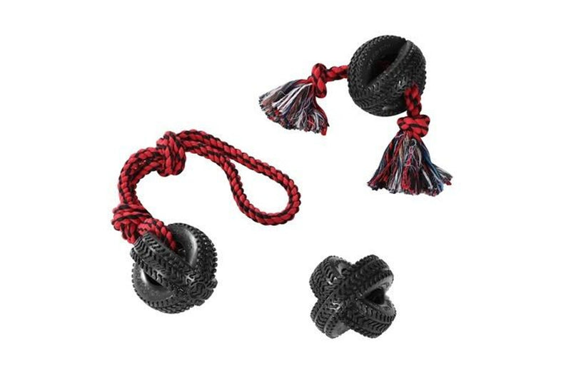 3x Paws & Claws Pet Dog 4-Way TPR Tyre 40cm Double Tugger Rope Chew Toy Fun Play