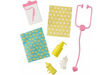 Barbie baby doctor doll is ready to see patients with furniture for an exam table and accessories to care for two adorable babies. Details are realistic with colorful touches and office-inspired elements. Teal scrubs and white shoes are a perfect professional look. Barbie baby doctor doll does double duty with an exam station that features two tubs, a moving mobile and storage space. Accessories let young minds care for baby patients with a stethoscope, two baby towels, a bottle and a medical chart.