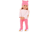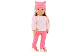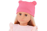 Our Generation 46cm doll Joyce is playfully bright in cute fashion! Dressed in head-to-toe pink, she wears a beanie hat with mini ears, a ruffle shoulder sweater, pants, and shoes with real laces to tie. Joyce has a huggable soft body and lifelike features that will delight doll fans during playtime. Her beautiful brown eyes open and close, and her light-blonde hair is fun to style in many ways.