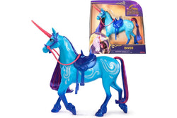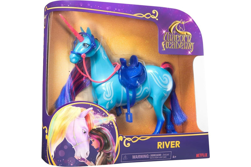 Inspired by the NETFLIX animated show and best-selling book series where friendship reins, this 11-inch River unicorn toy brings the gentle, shy creature to life. Beautifully detailed, River features pearlescent Water Magic markings on his side, majestic glittery horn, colorful mane and tail, and removable bridle and saddle doll accessories for added play. Gently move River’s head to bring out his personality and relive the magical bonding experience between unicorn and rider with Isabel. Brush River’s soft mane and tail with Isabel’s styling tool (not included, sold separately with doll) and ride into adventure to protect Unicorn Island and its magic!