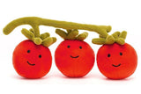 The Vivacious Vegetable Tomato pals are a giggly gang hanging out in the sun! Plump and stretchy in orangey-red, this tomato trio sit on a soft green vine. With soft green leaves and smiley faces, they’re the pick of the patch!