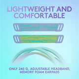 The suspension headband design distributes weight and relieves pressure points. Soft, breathable memory ear cups and sports mesh material surround the ear and provide just the right amount of force to stay firmly in place. At only 240 grams, G335 is a smaller and lighter version of the award-winning G733 LIGHTSPEED wireless headset.