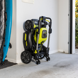 All controls are conveniently located on the handle where you can choose from three cutting modes, check battery charge levels and adjust the mower’s pace. The 10-step height adjuster (built into the carry handle) will provide the ideal length grass. When you’re done mowing, simply fold the handles and store it vertically in your shed or garage.