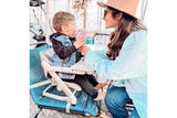 It has a sturdy and durable steel frame that supports children up to 3 years (15kg). It has 4 height levels that you can easily adjust by turning the dial on the side of the seat – great for all different feeding situations. A simple 3 step fold makes it the perfect on the go seat that can be taken anywhere and fits any chair.