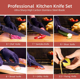 - Cool All-Black Coating: the Knives set made of superiou quality carbon steel & storaged in a cool black knife block with individual sharpener, This Kitchen Knife Set Almost meet your all cutting needs for cooking
