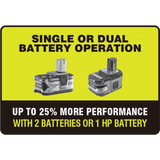 The Lawn Mower can operate with one or two RYOBI ONE+ batteries (sold separately). A single 18V ONE+ 6.0Ah battery delivers up to 25 minutes* of runtime. Two 18V ONE+ 5.0Ah batteries provide up to 40 minutes of runtime. Using an additional battery provides a bigger boost in performance and runtime — just what you need for taking on medium-sized lawns and thicker grass types.