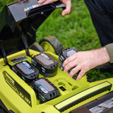 The mower has 4 battery ports – two active 18V battery ports are used to power the mower and two for on-board storage, making it easy to swap over batteries on the go and extend runtimes. Get up to 40 minutes of runtime with two 18V ONE+ 4.0Ah batteries* connected.