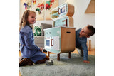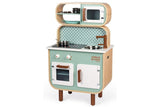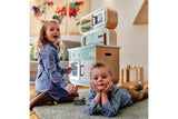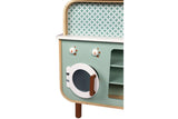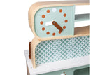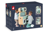 Flip the kitchen around so you can do the washing! The open shelves are perfect for storing your laudry powder and washbags. Just pop your washing in the front loader and move the dials to choose your load options. The washer dials also have sound effexts that ‘click’ when you turn them. Make sure you check the time on the clock so you know when the cycle is finished to come back and hang everything out to dry! Compact and contemporary, the Janod Reversible Kitchen and Laundry is perfect for teaching healthy and essential role play life skills which kids love emulating in the playroom and who doesn’t love a multi-functional toy that takes up very little room and looks great too?