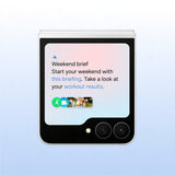 Flex Cam Bring your A-game to your selfies with Flex Cam on the Galaxy Z Flip7 FE. With a bold 50MP wide camera and an auto zoom that recognises the subjects of the photo and adjusts them to fit, for the perfect shot. Flex Window Make your Galaxy Z Flip7 FE even more you, with a dynamic outer cover screen display. Create premium wallpapers or enjoy automated display updates that respond to real world events, like the weather1, so your device is always looking fresh. Battery Get more out of the longest days with a powerful self-optimising 4,000mAh battery2 and a power efficient display on the Galaxy Z Flip7 FE, so you can rely on it to last, whether you’re working, gaming or watching shows on-the-go. Flex Mode Free up your hands for the fun stuff with Flex Mode3 on the Galaxy Z Flip7 FE. Flex it to capture selfies and group shots at awesome angles. Or, stand it up then sit back and relax while you watch your favourite content. Design Step up your style with the sleek floating design on the Galaxy Z Flip7 FE. It’s built to look good and be tough with a dual rail hinge to, durable armour aluminium and Gorilla Glass Victus4. What's in the box: Handset Ejection pin Quick start guide Data cable (C to C) 1. Requires internet connection. Mobile data fees may apply. Photo Ambient overlays the phone wallpaper with one of three weather animations. Weather animations are restricted to sunny weather, rain and snow. Weather animations do not vary based on intensity of weather event. 2. Actual battery life may vary by network environment, features and apps used, frequency of calls and messages, the number of times charged, and many other factors. 3. Flex Mode supported at angles between 75°and 115°. Some apps may not be supported in Flex Mode. 4. Gorilla Glass Victus is not applied to the camera lenses. Armour Aluminium is not applied to the volume and side buttons.