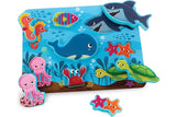This wooden peg puzzle comes with 1 sturdy boards and 8 colorful pieces that feature different Underwater animals. All the pieces are easy for tiny hands to grasp, and as children lift ‘em up, they’ll find a matching illustration underneath each one. Playing with this wooden puzzle not only comes with tons of matching fun, but it can also help toddlers improve their fine motor skills, hand-eye coordination, and problem-solving skills. Discover the full Peek & Explore collection from B. toys to find more colorful puzzles for the little one in your life! Recommended for children 2 years and over.