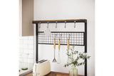 Place pots on the 3 shelves, customise the mesh panel by hanging cups and potholders, leave ladles and spatulas on the top hooks, and use the top narrow shelf for spice jars—now it’s up to you!