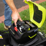 The dual battery ports hold two 36V batteries for extended runtime. When one battery runs out, draw power from the other by turning the port’s safety key. The one-touch handle system makes it quick and easy to fold the handles and store the Mower vertically, taking up less space in your shed or garage.