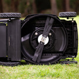 Dual Cross Cut blades produce a clean cut while generating low noise levels and efficient grass-catching performance. Smart load-sensing technology increases power for thicker grass. It also conserves battery power by only engaging high blade speeds when required.