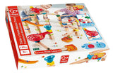 The *Hape – Marble Cascade Block Set includes a jump, a bell-bucket, a spiral funnel, a ringing bell, and a sliding track for your marbles to get through! Great for encouraging hand-eye coordination, planning, and logical thinking.