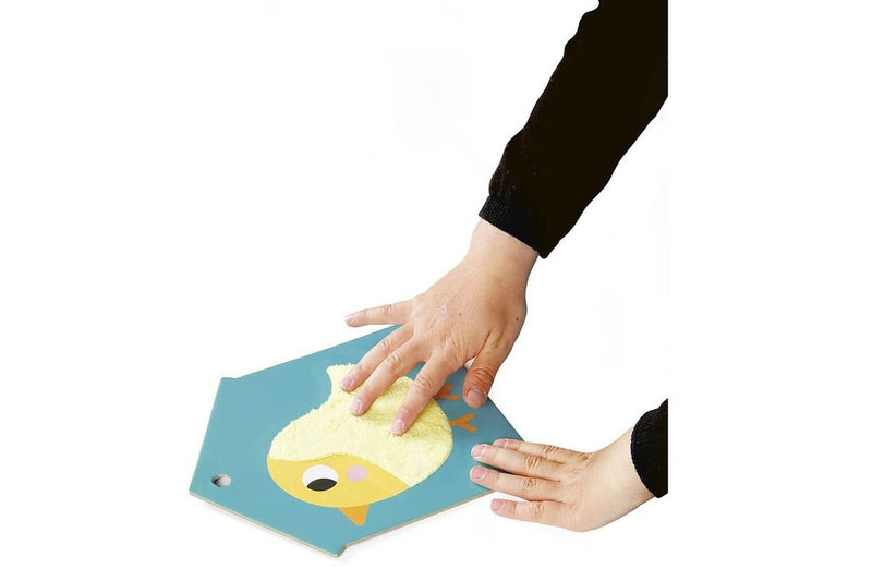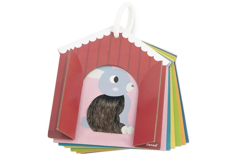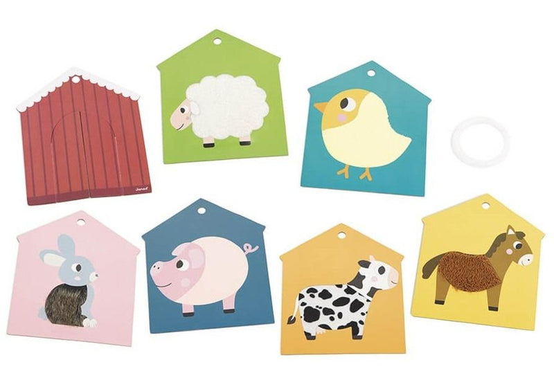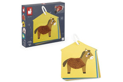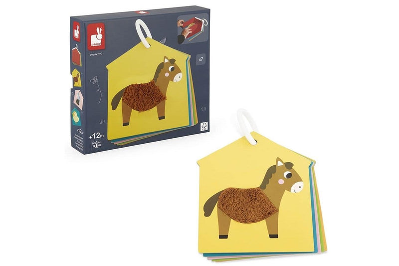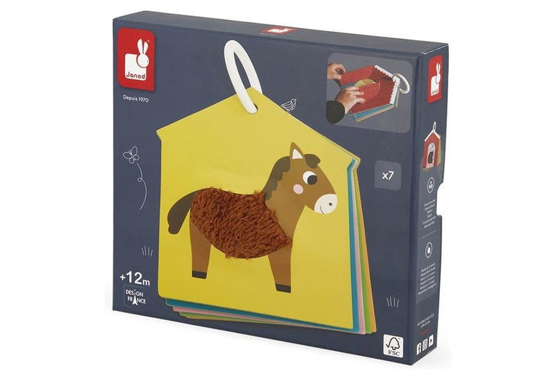 With the Farm Tactile Cards form Janod your little ones will explore, marvel and learn more about the world around them through touch. Take them on a journey through the world of the farm by having them stroke a sheep, a pig, a cow, a rabbit, a chick or even a horse. Large areas of different textures allow little hands to become familiar with different materials – the soft fur of the rabbit or the smooth skin of the pig. The set of 6 animal cards are bound by a removable ring to keep the cards together and carry them around easily. Each FSC cardboard page measures 16 × 18 cm, a large size that allows babies aged over 1 year to grasp them easily.