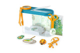 Collect real or pretend insects, butterflies, frogs, and more with tweezers and a scooper and pop them in the durable plastic terrarium with lid and carrying handle. Use the magnifying cap and six double-sided ID cards to observe them in their new home! The terrarium has a removable base and a double-sided background card and can be filled with water, sand, or dirt. Enhance pretend play for kids four and older with two plastic critters (ladybug and lizard) to catch and observe.