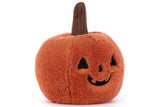This rust-red pumpkin has textured segments, a brown cord stalk and a beany base. No need for carving – that toothy grin is stitched to perfection! Jack brings Halloween fun, year after year.