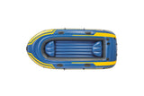 The Challenger 3 inflatable boat is perfect for three adults to enjoy a fun summer of boating. Whether fishing, relaxing, or rowing on the lake, this boat is great for making your adventure exciting and entertaining. This sports boat is equipped with convenient motor mount fittings to allow for a trolling motor. Designed with heavy duty, puncture resistant PVC for comfort and durability, and an inflatable I-beam floor for rigidity, the boat contains three air chambers including an inner auxiliary chamber inside the main hull for extra safety. Inflating and deflating is a breeze with two quick-fill Boston valves. Enjoy comfortable seating with the two inflatable seat cushions. A grab handle on the bow and an all-around grab line are provided for your convenience, as well as two pairs of welded oar locks and oar handles, U.S. Coast Guard I.D. and a repair kit. Also included are two 48 inch Aluminum Oars and an Intex high-output pump for easy inflation or deflation.
