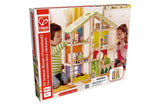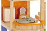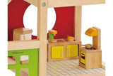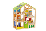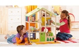 There are as many ways to play with this wooden doll house as families in the world. Six rooms, moveable stairs, and a reversible winter/summer-themed, solar-paneled roof inspire year-round activities.