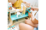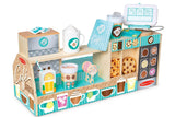 - Be the barista or the customer with this sturdy wooden coffee shop counter with a built-in play espresso maker, drink dispenser and frother, swiveling pay terminal, and wooden play food pieces and accessories