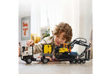 - Volvo truck toy with flatbed trailer, toy excavator and charging station
