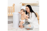 The sleek Ubbi diaper pail includes a child-proof lock and is available in an array of colors.