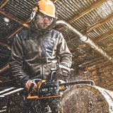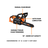 Powered by a brushless motor, experience longer runtimes and less maintenance with the 18V 12” Chainsaw. This model features a 12” bar, 10m/sec chain speed, and an inertia and manual activated chain brake. For prolonged life and usage, this model has an automatic chain lubrication system. The onboard belt hook enables portability when working at heights.