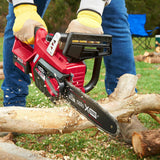 Safety features include an automatic chain brake that will engage in the event of kickback and metal bucking spikes that assist with the cutting action and help reduce the possibility of kickback.