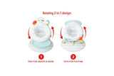 Encourage baby to sit, interact and play with this comfy and supportive seat. The dual-option design lets parents rotate between the handy multipurpose tray (great for snacks!) and three engaging toys depending on babys needs. The sturdy, wide-leg base provides stability and the soft fabric seat cover removes for easy machine washing so clean up times a cinch.