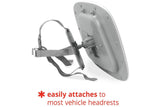 - Attaches to most vehicle headrests